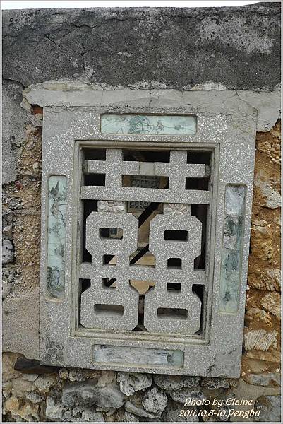 - 曾家古厝正面門樓採取「倒吞吟」的模式,請門樓上頭處理成平坦的磚坪,通常用作曬魚乾或花生之用。正立面的鳥踏之上裝飾有日式5x5花磚,極其典雅華麗,且牆壁的石材有別於澎湖大部分古厝是用咾咕石砌成,曾家古厝是以玄武岩所砌。